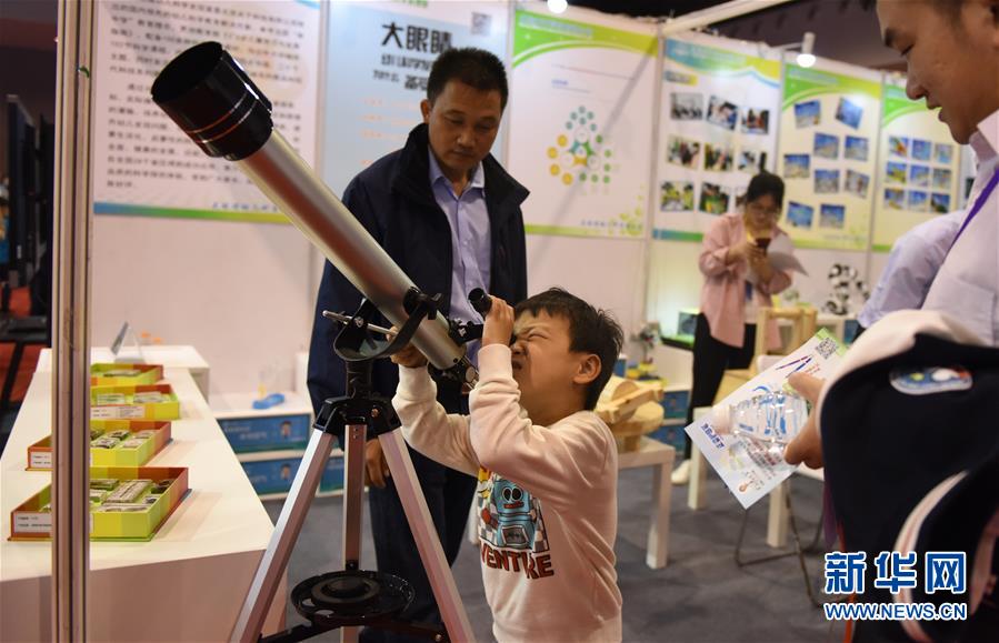 3月17日,一位小朋友在展会现场体验望远镜。当日,2018广州国际儿童创新教育博览会开幕。据了解,本次展会展出面积达30000平米,共有800余家参展商参加本次展会。 新华社记者 卢汉欣 摄