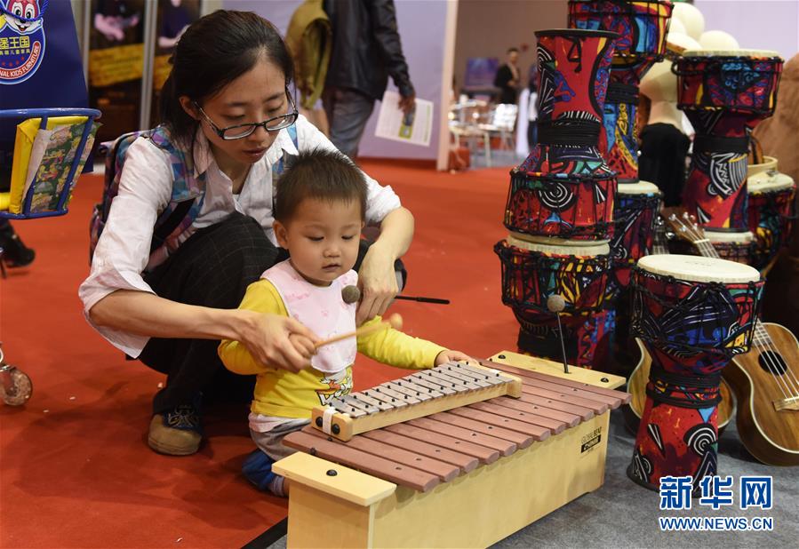 3月17日,一位小朋友和妈妈在展会现场玩乐器。当日,2018广州国际儿童创新教育博览会开幕。据了解,本次展会展出面积达30000平米,共有800余家参展商参加本次展会。 新华社记者 卢汉欣 摄