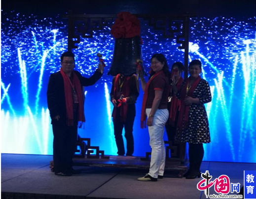 图为敲钟仪式,左(一)为名师苑教育创始人、总校长钟铭右(一)为名师苑教育董事长、总校副校长、海月分校校长杜玉萍