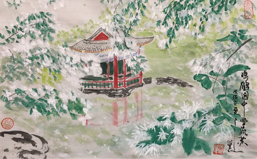 千黛画作:鸣鹤园中雪流苏