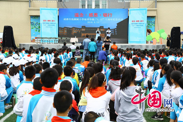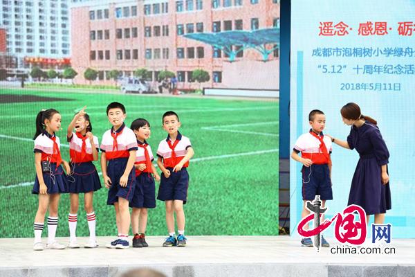 2018年5月11日,在成都市泡桐树小学绿舟分校“5·12”汶川大地震感恩纪念活动上,学校师生根据当年情景创作了舞台剧,以独特视角,再现了2008年5月12日那天的片段。老师们冲进教室将偷溜回教室里的孩子抱出,操场上,有的孩子不知所措、有的孩子惊慌恐惧、有孩子的惊魂未定,师生们彼此牵手、问候、拥抱。孩子们用稚嫩却又动情的表演重现了板房中度过的时光,在他们无忧无虑的天真眼神里,地震的阴影在慢慢散去,学习生活又恢复到平静。