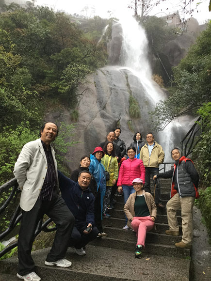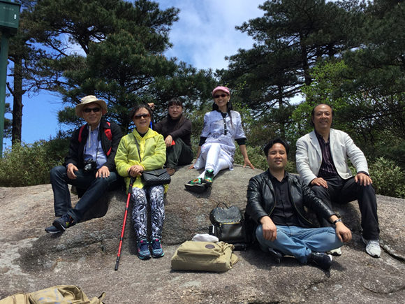 千黛与部分画家在三清山龙虎庙旁岩石上远眺