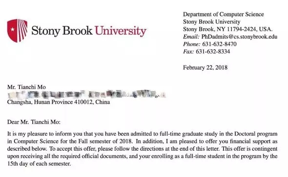 从今年2月开始,莫天池开始陆续收到国外大学的录取通知——纽约州立大学石溪分校、英属哥伦比亚大学、华盛顿大学、雪城大学、波士顿大学、匹兹堡大学、纽约州立大学布法罗分校、新泽西理工学院……一所所名校都向这位中国少年伸出了橄榄枝。最终,莫天池选择了纽约州立大学石溪分校攻读计算机科学博士学位,并获得全额奖学金。