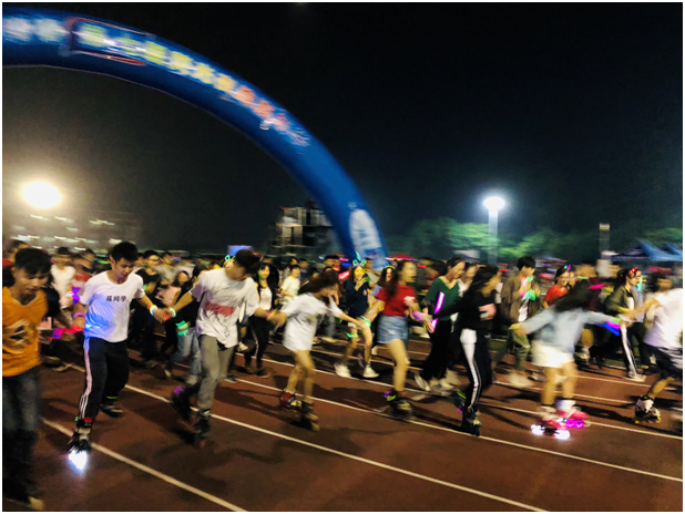 足球啦啦队的舞蹈、武术协会冷焰火表演,在微风习习的操场中瞬间点燃了气氛。当陈磊发出夜跑启动的指令后,参与活动的同学手舞荧光手环,在夜色中迈开步伐。今年,荷兰的小伙伴也加入了夜跑的队伍,和全校近5000名学生一起,以黑夜为幕,绘制出星星点点的画作,成为华广校园闪亮的一道风景线。
