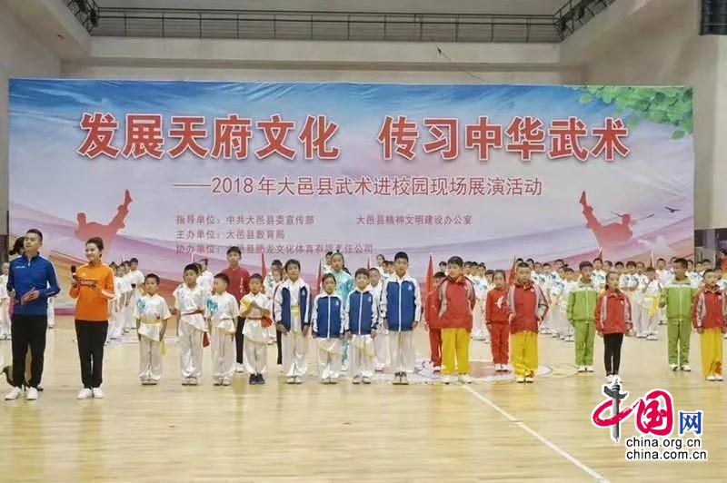 据悉,大邑县作为道教发源地,民间太极拳爱好者为数众多,大邑县委、县政府、县教育局借力自身优势,把武术作为未成年人思想道德建设的重要载体。自2013年以来就在全县范围内组织中小学校常态化开设太极拳武术健身操课程及相关比赛活动,结合乡村学校少年宫打造,已形成一批特色鲜明的展演项目,并承办了“‘运动成都’2017年成都市青少年武术套路冠军赛”等活动。
