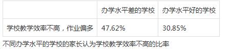 还有占比32.58%的家长认为“学校教学效率不高、作业偏多”是学生学业负担过重的主要原因。报告显示,即便家长认为自己子女就读学校办学水平不错,也有30.85%的人认为“学校教学效率不高,作业偏多”,课内损失课外补,从而加重了学生的负担。