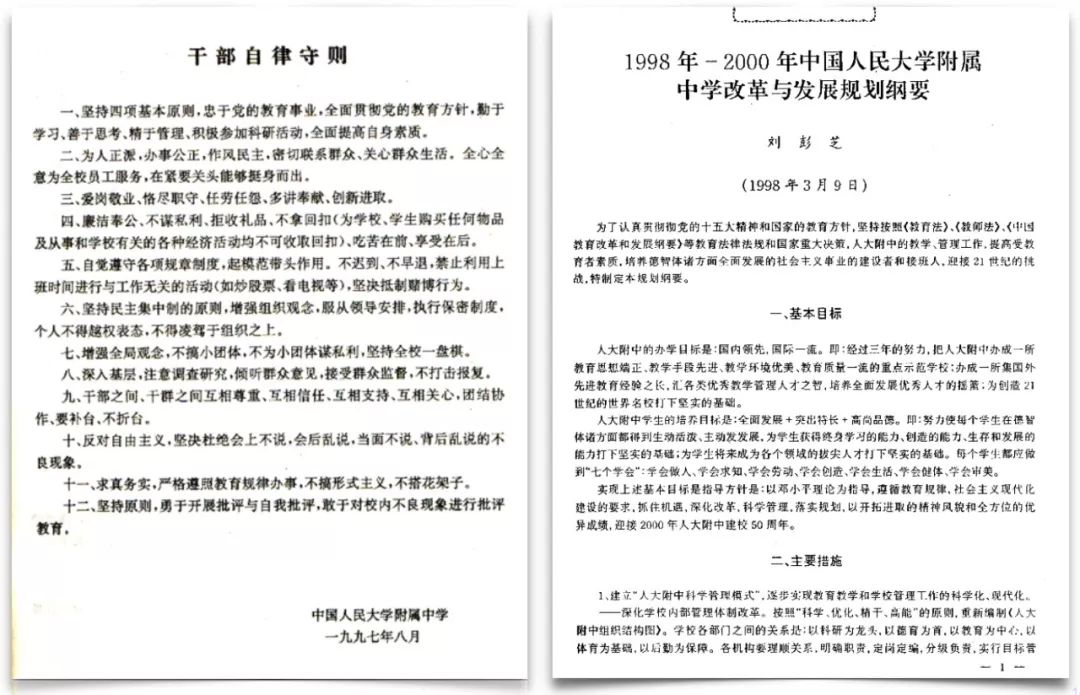 1997年8月,刘彭芝担任校长刚一个多月,在新一届班子首次干部会上,就出台了人大附中的第一个制度——《干部自律守则》,守则一共12条,条条都源于当时校园的实际情况,极具针对性,一旦违反,就要接受处罚。随后,刘彭芝开始大力整治校园环境,人大附中的办学目标、办学理念、学生培养目标等也先后出台。