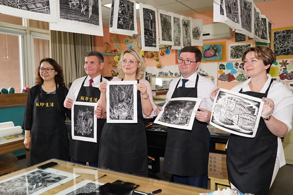 在书法教室,学生的书法作品吸引住了客人们的目光,大家饶有兴趣的拿起毛笔临摹下栩栩如生的“龙”字,书法教师齐振伟还现场挥毫写下“友谊地久天长”“福”字赠送给代表团成员。