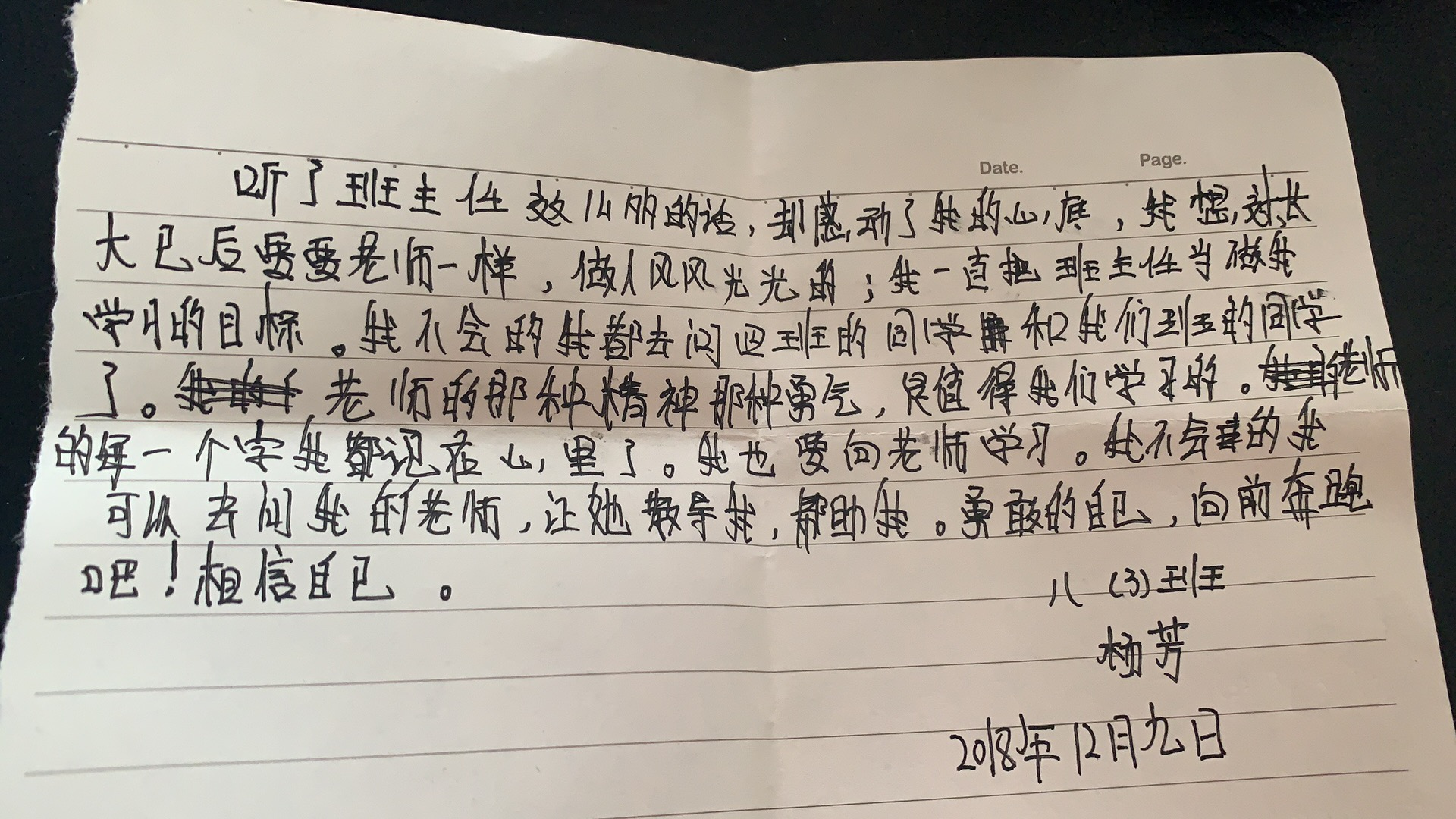 学生们字里行间流露出的真挚的感情,和一句句关怀而温暖的话语,打动着马露露,也为她继续前行提供了动力和勇气。她说:“成为教师,扛起了那份责任,就想把自己所学全部教给学生,真心希望他们能变得更好。”