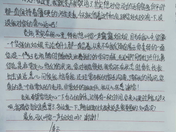 “老师,其实在我心里,特别想叫你一声露露姐姐,因为在我心中,你是一个坚强的姑娘,无论有什么都一直忍着,从来不在我们面前展示你柔弱的一面……”
