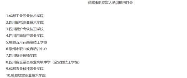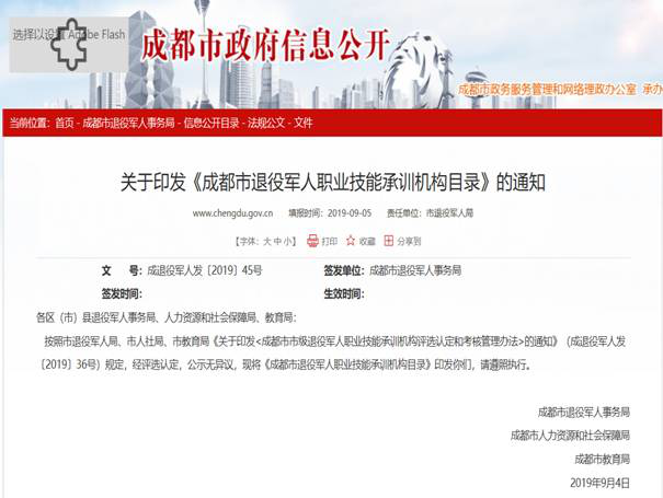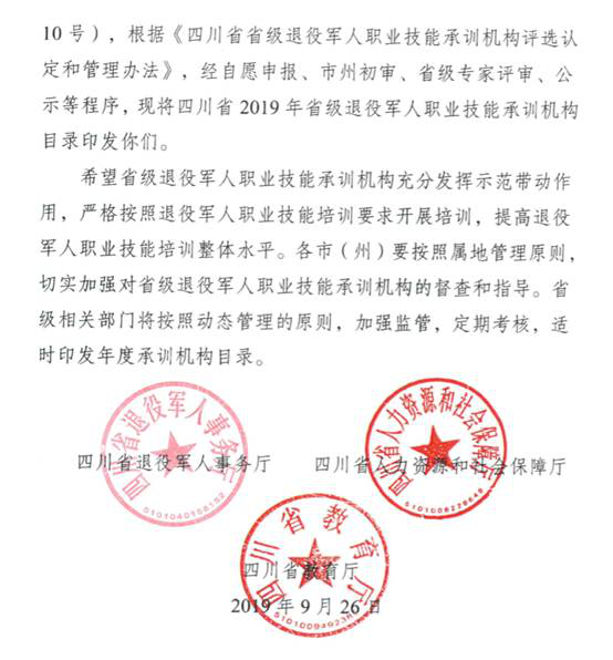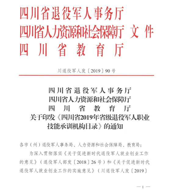中国网10月12日讯(李小野)近日,四川省退役军人事务厅、四川省人力资源和社会保障厅、四川省教育厅以及成都市退役军人事务局、成都市人力资源和社会保障局、成都市教育局分别印发《关于印发四川省2019年省级退役军人职业技能承训机构目录的通知》(川退役军人发〔2019〕90号)《关于印发成都市退役军人职业技能承训机构目录的通知》(成退役军人发〔2019〕45号),共同批复成都航空职业技术学院为四川省、成都市两级退役军人职业技能承训机构。