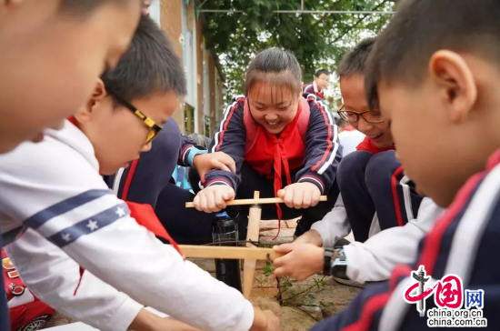 5-6年级同学们来到“小脚丫营地”开展研学旅行。营地拓展第一课便是“钻木取火”。让孩子们在协作沟通中,发挥集体智慧,努力完成任务。