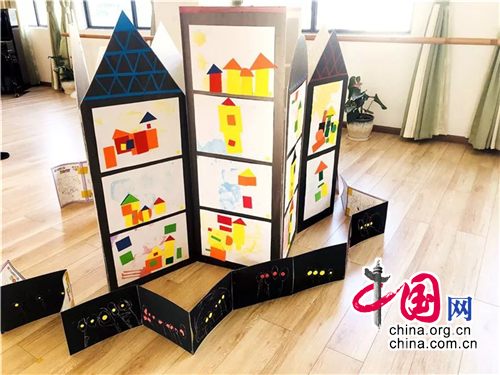 我的幼儿园和我的家都有许许多多的色彩,利用彩色瓦楞纸裁剪出不同的几何形状,让“七宝”在了解形状的同时,尝试用几何形拼贴出房子的样子。