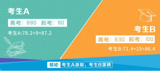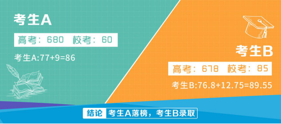 通过分数折算后,如上图所示,虽然考生B通过竞赛金牌获得破格入围资格,且校考计满分,但其高考成绩与考生A相比相差过多,导致最终遗憾落榜。