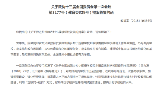 当年5月,国务院办公厅下发了《关于全面加强乡村小规模学校和乡镇寄宿制学校建设的指导意见》,实行对不足100人的学校按100人拨付公用经费政策,对寄宿制学校按照年生均200元标准增加公用经费补助等办法。教育部在该提案的答复函中也表示,下一步教育部将进一步加强对农村小规模学校和乡镇寄宿制学校建设的指导,督促各地落实《关于全面加强乡村小规模学校和乡镇寄宿制学校建设的指导意见》,为农村学生提供良好义务教育。而新东方也通过 “一校一梦想——新东方助梦行动”、“烛光行动——新东方教师社会责任行”等活动,继续对乡村学校进行软硬件、师资培训等各方面的支持。