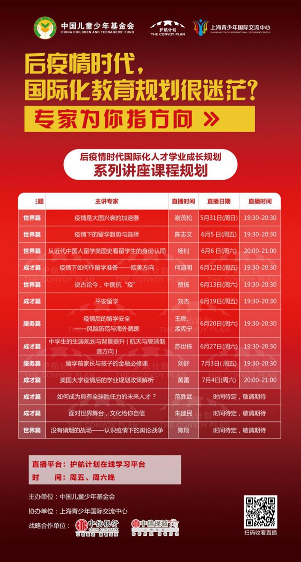 疫情对国际交流带来重重阻碍,签证的收缩、一些国家民粹主义的抬头、考试的取消,都为时下学子是否选择国际教育路线、如何应对突发的变数带来了迷惑和挑战。护航计划联合上海青少年国际交流中心,在5月31日-7月4日,重磅策划后疫情时代国际化人才学业成长规划系列讲座,把握信息渠道来源,云集专家大咖资源,解读国际形势变局,协助家长和学生正确认识现状,走出迷茫困局,理性应对影响,合理规划求学成长之路。课程将在护航计划线上课程平台持续推出,敬请各位老师推荐家长、学生收看。