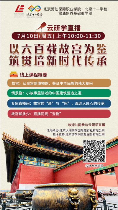 今年,是紫禁城600岁生日,也是故宫博物院成立95周年。继“云研学之垃圾分类”之后,北京劳动保障职业学院贯通培养基础教学部将于7月10日通过网络直播的形势走进故宫博物院,带领学生了解中国古代建筑所体现的匠心精神、感受中华传统文化的独特魅力,领悟五千年华夏文明的深邃与博大,激发学生热爱祖国的思想感情,增强学生的民族自豪感。