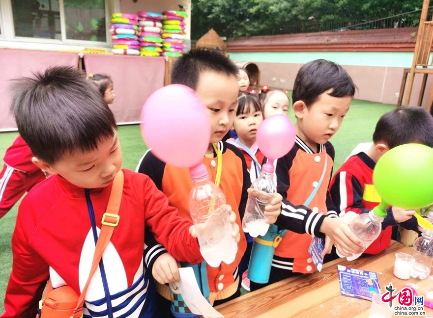 观察了物理现象,孩子们又观察了化学现象,将会与水发生反应产生气体的粉末倒进瓶中,再将气球套在瓶口。大家兴奋地发现气球被“吹”胀了。
