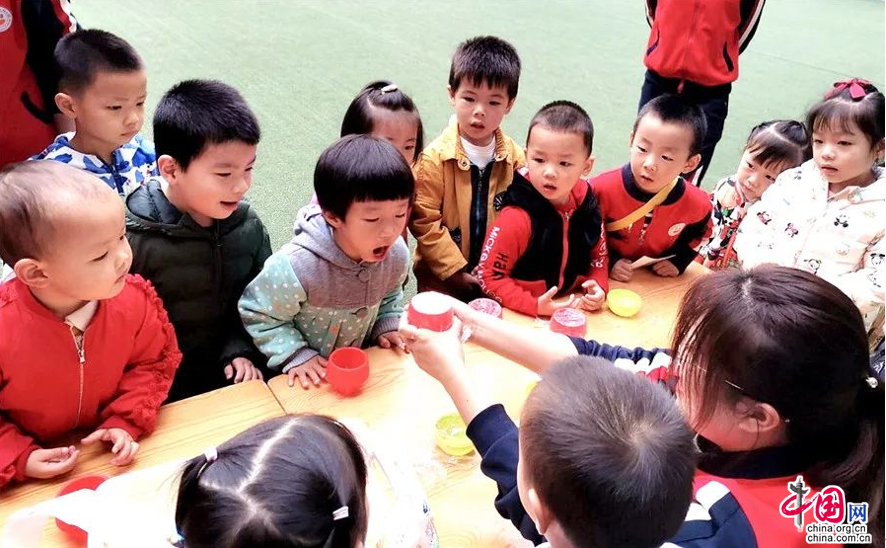 “你知道盐会跳舞吗?”孩子们张嘴,对着平面上的盐粒发出声音,盐粒通过声音的共振现象“跳起舞来”。声音还能通过介质传播,孩子们拿起纸杯和线制作的简易电话,体验了传声筒的魅力。
