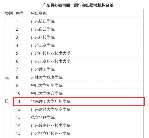 11月2日,获悉在广东省民办教育协会组织的广东民办教育四十周年“突出贡献人物·机构”评选活动中,华南理工大学广州学院被评为“广东民办教育四十周年突出贡献机构”,成为为数不多的获奖高校。