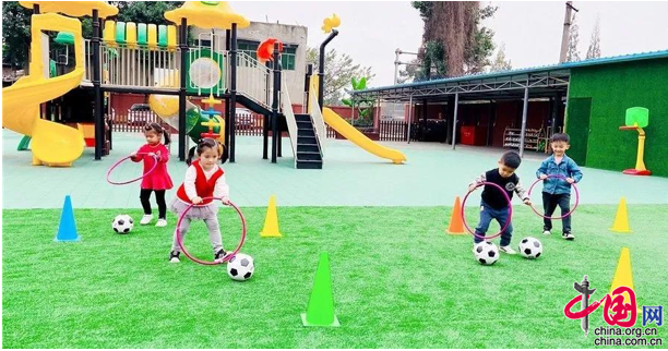 百草园区的运动会也热闹非凡,孩子们率先带来呼啦圈和足球的集体操表演,随后利用这两项道具,进行带球障碍赛,孩子们拿着呼啦圈推动足球,绕过一个又一个路障,顺利到达终点。