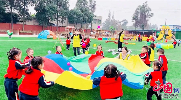 团体游戏彩虹伞,孩子们各执一端,围成一个大圆环,大家随着口令一起举、一起放,彩虹色的伞面上,活力的小球跟着起跳下落,既具有观赏性,又锻炼了孩子们的团队协作能力。