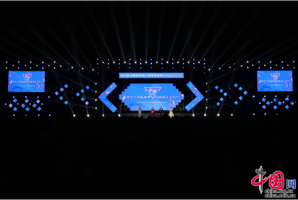 “十年的光阴,可以篆刻下什么?一个人,可以从稚嫩走向成熟;一座城,可以旧貌换新颜;十年,足以磨砺一个人,建起一所学校,定义一段共同奋斗的鎏金岁月;十年,我们风雨共担,写下这首诗,致敬与你们同行的日子……”晚会在校领导情景朗诵《风雨共担,鎏金十年》中拉开序幕。朗诵回顾了学校发展的艰辛,展现了学院取得的辉煌成就,描绘了学校未来的宏伟蓝图。川港项目合作高校成都信息工程大学、阿坝师范学院带来的鼓乐表演《开元盛世》,在锣鼓与中国民族乐器的齐奏共鸣中,展现了恢弘的盛世场景,掀起了晚会的第一个高潮。