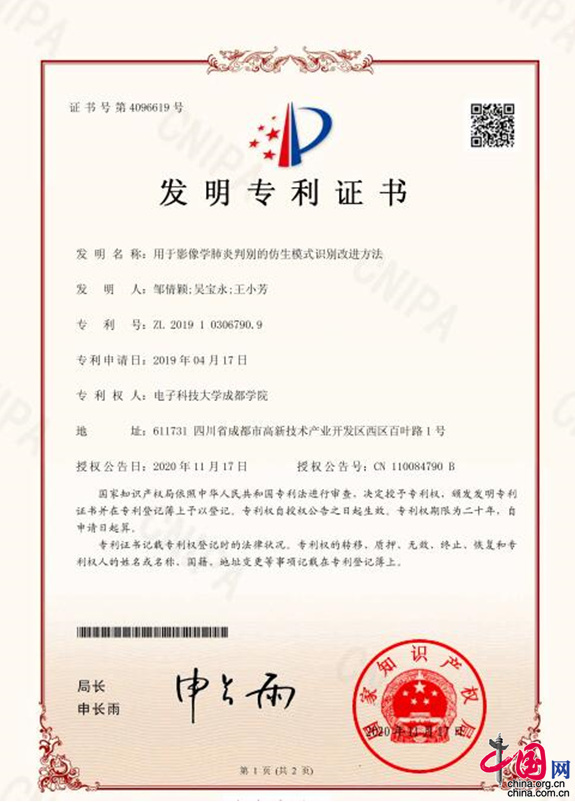 中国网12月2日讯(宋得恩)近日,由电子科技大学成都学院计算机学院教师、大数据智能实验室负责人邹倩颖等3人申请的专利《用于影像学肺炎判别的仿生模式识别改进方法》获得国家发明专利授权。