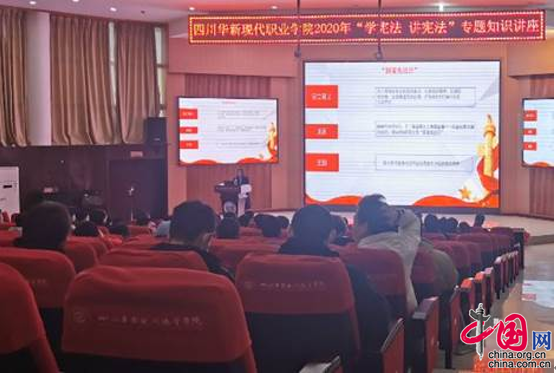 中国网12月7日讯(钟传亮)推动教育系统宣传宪法,弘扬宪法精神,维护宪法权威,近日, 四川华新现代职业学院学工部(学生处)举办了2020年“学宪法 讲宪法”专题知识讲座。讲座特邀律师事务所的蒋丽律师带来“学习法治思想弘扬宪法精神”专题讲解。