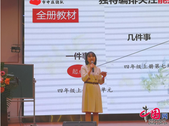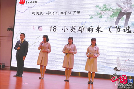 活动中,市中区团队展示了四年级下册《小英雄雨来》,柏杨小学老师刘叶霜承担了文本解读板块展示。展示中,刘叶霜聚焦编排价值、文本价值、教学价值解读此文本,开启与编者对话,从整套教材入手,寻找语文要素之间的关联性,发现本单元语文要素——把握长文章的主要内容,呈序列编排;从整册、单元的视角出发,可知统编教材也具有整体性;再从文本原生价值入手,向与会老师阐述文章的独到之处,即两处伏笔、反复手法、环境描写。刘叶霜结合编排价值、文本价值,站在以生为中心的立场上,将此文本的教学价值解读为习策略、悟形象、润生命,从能力成长到精神成长,学生则收获成长。据介绍,最终,刘叶霜所在的市中区团队赢得了一等奖。