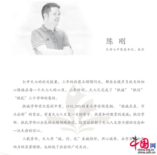 显示在首页的是校长陈刚。新的时代,千帆竞发,百舸争流,天七就像是一艘巨轮,承载着莘莘学子的梦想。而陈刚校长就像是一个船长,引领着天七这个航船不断前行。周历中,54个周分别展示了天七执诚、执信、执礼三个学部,54个班级的班级文化,第1-15周展示初2020级;第16-19周展示高2020级;第20-36周展示初2018级;第37-54周展示初2019级。包括班徽、主任导师寄语、24节气及节假日备注、周次标注、本周日期标注和有着天七暗纹的可撕便签等。
