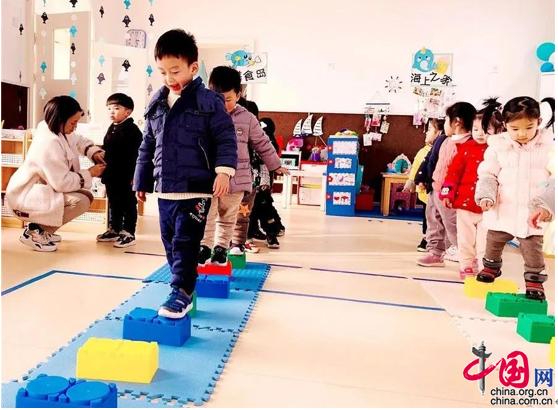 教师创设了“搭桥过河”的游戏场景,孩子们就地取材,一个个积木被搭建成了小桥,孩子们有序踩着积木“过河”。