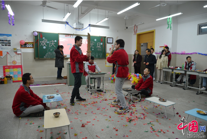 每班有特色,班班不一样。在张灯结彩的教室里,同学们各展所长,唱歌、跳舞、小品、话剧……纷纷上演。张涛一行每走一个班级都会走进教室与同学们互动,送上祝福。也有特别精彩不忍打断的时候,便只站在门外静静地观看!