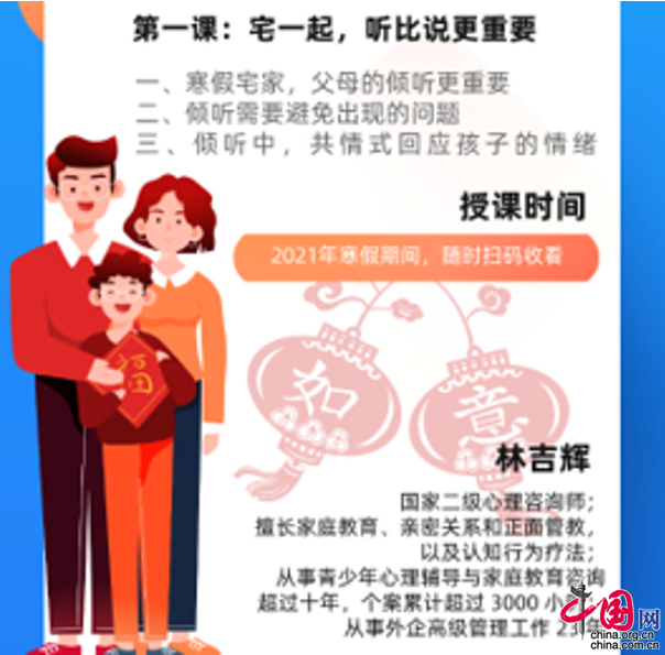 中国网1月29日讯(刘杨)近日,成都市武侯区家长学校总校将在寒假期间推出“诸葛家长学堂”云课堂系列讲座,为家长和孩子更好亲子沟通,缓和亲子关系提供良方。