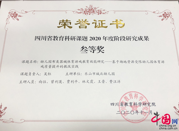 中国网2月3日讯(向往 吴红)近日,“2020年四川省教育科研阶段性成果奖”公布,乐山市城北幼儿园省级资助金项目课题《幼儿园布类器械体育游戏教育效能研究——基于场地资源受限幼儿园体育游戏质量提升的教改实践》,在此次评选中获得四川省教育科研课题阶段成果三等奖。