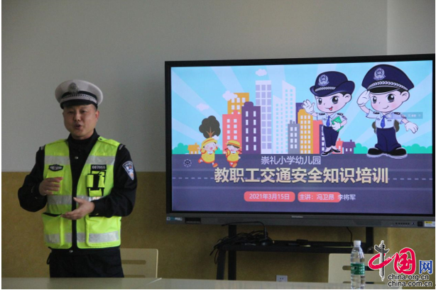 中国网3月17日讯(周衫杉 赵科)为进一步增强全体教职工的交通安全意识和上下班途中的自我保护能力,践行“生命至上、安全第一”理念,近日,眉山市东坡区崇礼小学幼儿园邀请东坡区崇礼镇交警中队队长冯卫昂和民警李将军为全体教职工上了一堂生动的“交通安全教育课”。
