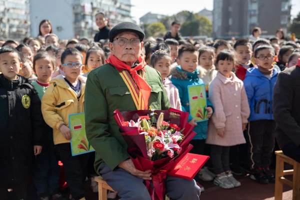 在升旗仪式上,曹爷爷向全校4000余名师生介绍了自己的战争经历,回忆起许多牺牲的战友,曹邦裕爷爷不禁感慨:“今天安定富裕的生活来之不易,我们不能忘记千百万革命先烈的流血牺牲,我们现在优越的学习环境,在当年想都没有想到,我们一定要热爱祖国,热爱人民,热爱中国共产党。”