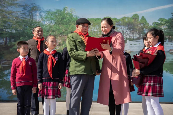 在王笑梅、蒋晓飞校长和红领巾小讲解员们的陪同下,曹邦裕爷爷一行先来到蕊春园参观,这里也曾经是他三个子女儿时的母校,看到如今的变化,曹爷爷感慨万千。