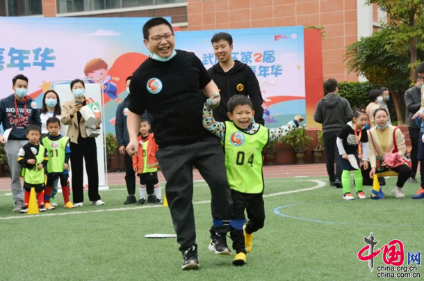 “齐心协力”游戏的现场,孩子和父亲的一条腿绑在一起,两人三足共同前进,一边喊着“左右左、左右左”的口号,一边全速前进。
