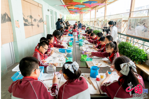 魏秋月老师的美术课《入画》,打破常规课堂形式,充分利用学校第三空间,与学生一起鉴赏扇面画、构图扇面画之后,在美术工作坊在扇面上着墨中国画,有效充分利用不同场景。