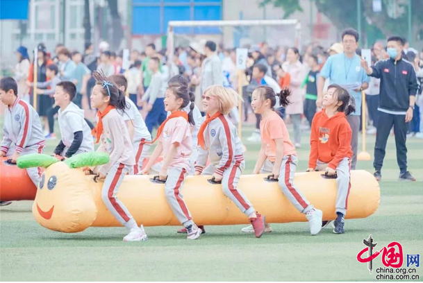 团队赛中,孩子们集体坐在“充气毛毛虫”上,齐心协力,与其他队伍展开竞速,在统一步调的口号声中,孩子们学会了团结协作,收获了友谊。