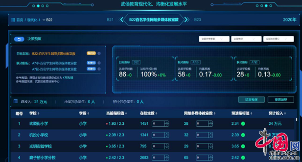 教育现代化、均衡化、国际化是成都市评价县域教育发展水平的重要考核目标,涉及诸多数据和算法。武侯区将其作为“智慧大脑”建设的重点场景进行打造,将历年的数据和指标算法写入平台,通过比较其他区域发展趋势和每个学校发展不足,精准找到发展弱项,针对问题进行学校资源的精准配置。