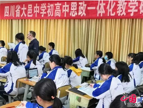 中国网4月29日讯(王宋玲)“办好思想政治理论课,最根本的是要全面贯彻党的教育方针,解决好培养什么人、怎样培养人、为谁培养人这个根本问题。”为落实立德树人根本任务,改进中学思政课教学,促进中学思政课一体化建设,4月27日,四川省大邑中学举行初高中思政课教学研讨会,研讨会从课堂教学探讨、德育课程研究、教学情境创设等方面进行了探讨,对中学思政课教学做了创新性探索和思考。