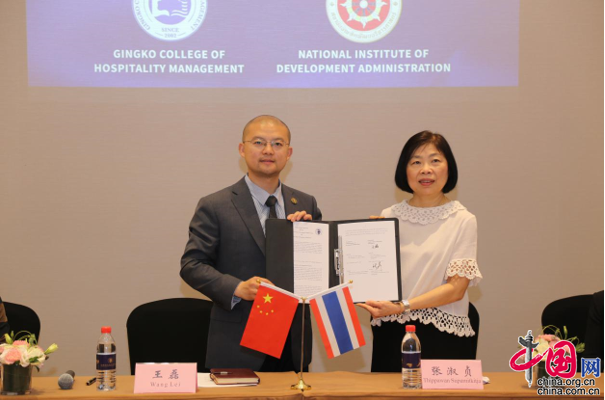 在张淑贞的见证下,成都银杏酒店管理学院与泰国国家发展管理研究生院(National Institute of Development Administration,NIDA)“云”签约仪式顺利举行。魏昭院长与NIDA校长Prof. Dr. Kamphol Panyakometh签署校级友好合作协议;紧接着,学院财务管理系负责人王磊副教授与NIDA经济发展学院院长Assoc. Prof. Dr. Amornrat Apinunmahakul签订院级项目合作协议。根据协议,双方将在学历提升、专业建设、师资培养、学术研究等方面展开合作。