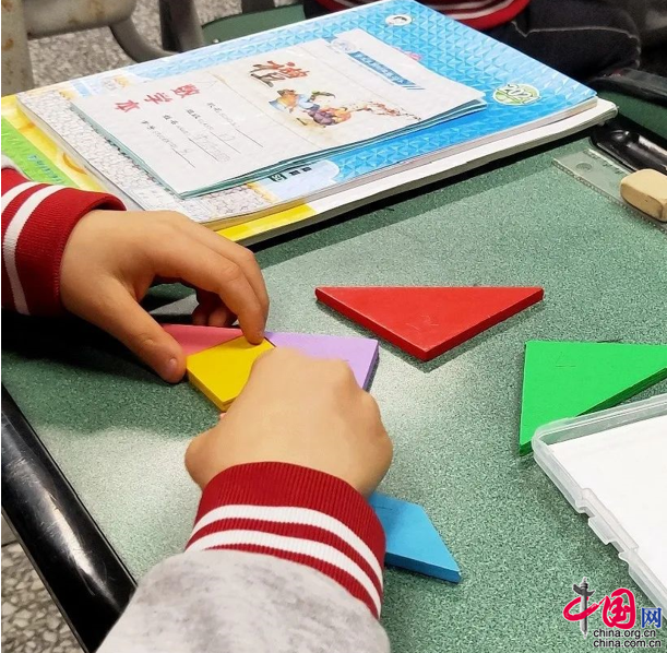 数学课上,周美静老师执教《动手做(二)》,利用七巧板拼摆平面图形并创造性地拼其他图案,激发学生的创新意识,培养学生的动手操作能力、空间想象力和创造力,感受图形之趣;赵波老师执教《认识图形》,通过引导学生运用描一描、印一印的方法感受立体图形与平面图形之间的联系,建立“面在体上”、“面从体出”的空间观念,体会这些平面图形在生活中的普遍存在,体会数学与生活的紧密联系。