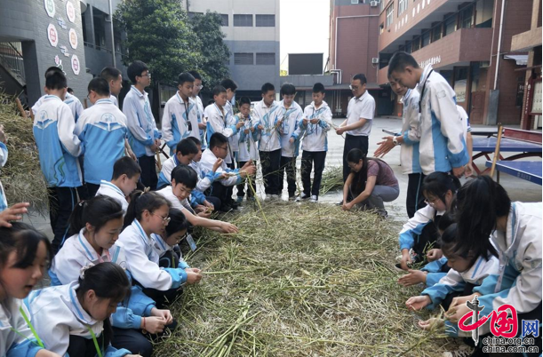 围圈的学生有的用手搓,有的用棍敲,极具动感的场面感染了围观的师生,操场上响起了阵阵掌声。“我们班劳动教育基地的油菜成熟了,孩子们前天就去割油菜,并抱回了学校。”初一四班班主任张春晖和学生一起敲打着油菜,“但我们没有专门的打油菜籽的工具,孩子们就用最原始的方法,在操场上脚踩手搓棍敲,充分了发挥了人多力量大的优势。”牵开口袋,刷刷的声响中,一铲铲油菜籽装进了口袋,足足五十多斤。