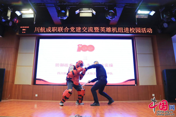 同时,四川航空空保支队的队员和成都职院空中乘务专业学生进行了技能展示。空保支队的技能实操展示了一支在党的领导下政治过硬、纪律严明、专业化、规模化的空中保卫队伍;空乘专业学生的“民航客舱救护技能展示”复原了客舱双人心肺复苏的真实场景,诗歌朗诵《百年礼赞》歌颂了中国共产党建党100周年丰功伟绩。