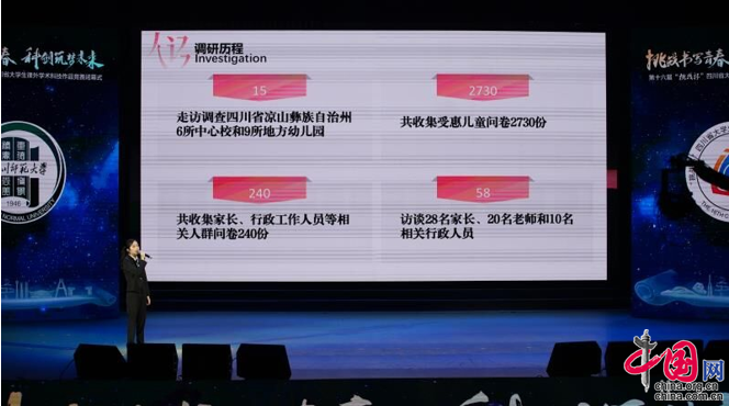 同时,四川师范大学的参赛团队分享了他们深入大凉山地区,开展的四川彝区“学前学会普通话”行动成效调查研究。项目汇报人高雨晴介绍,此次调研,项目组成员走访调查凉山彝族自治州6所中心校和9所地方幼儿园,共收集受惠儿童问卷2730份,收集家长、行政工作人员等相关人群问卷240份,访谈28名家长、20名老师和10名相关行政人员。团队成员通过调查分析得出,意识史态视野下的学前学普行动,铸牢中华民族共同体意识的必要一环,家校共育促进族群亲近,增进个人国家认同、民族认同和文化认同。为此,团队提出研究建议:夯实意识史态的文化记忆,守望共同的精神家园;形成社区意识形态,共建多元一体文化;规划长期意识形态政策,推进全民学普常态化;关注意识形态的针对性效果,建立共同体意识分布式联结。