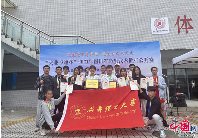 中国网5月26日讯 (王李科)由四川省武术协会、四川省学生体育艺术协会联合主办,四川省高等教育学会体育专业委员会承办的“2021年四川省学生武术散打公开赛”日前在成都市大邑县体育中心举行。本次比赛有四川大学,成都大学,成都中医药大学等17所高校及多所中、小学,共1300余人参赛。成都理工大学参赛队由14名运动员组团参赛。经过激烈角逐,该校散打健儿不畏强敌、敢打敢拼勇夺两金。并因顽强拼搏精神的获得“体育道德风尚奖运动队”的荣誉称号。同时,该校带队教练焦玉雷因优异的临场指挥,被评为赛事“优秀教练员”。