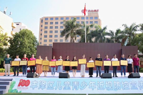 最新调研显示,近半年来中小学生的近视率增加了11.7%,其中小学生近视率增加了15.2%、初中生近视率增加了8.2%,高中生近视率增加了3.8%,近视防控已成为全社会关注的重要议题。5月26日,泉州市丰泽区教育局、泉州市丰泽区卫健局举行 “呵护眼睛 点亮未来”2021泉州市丰泽区儿童青少年近视防控宣传活动,评选出15所儿童青少年近视防控示范校并授予泉州爱尔眼科医院“丰泽区青少年近视防控科普基地”。